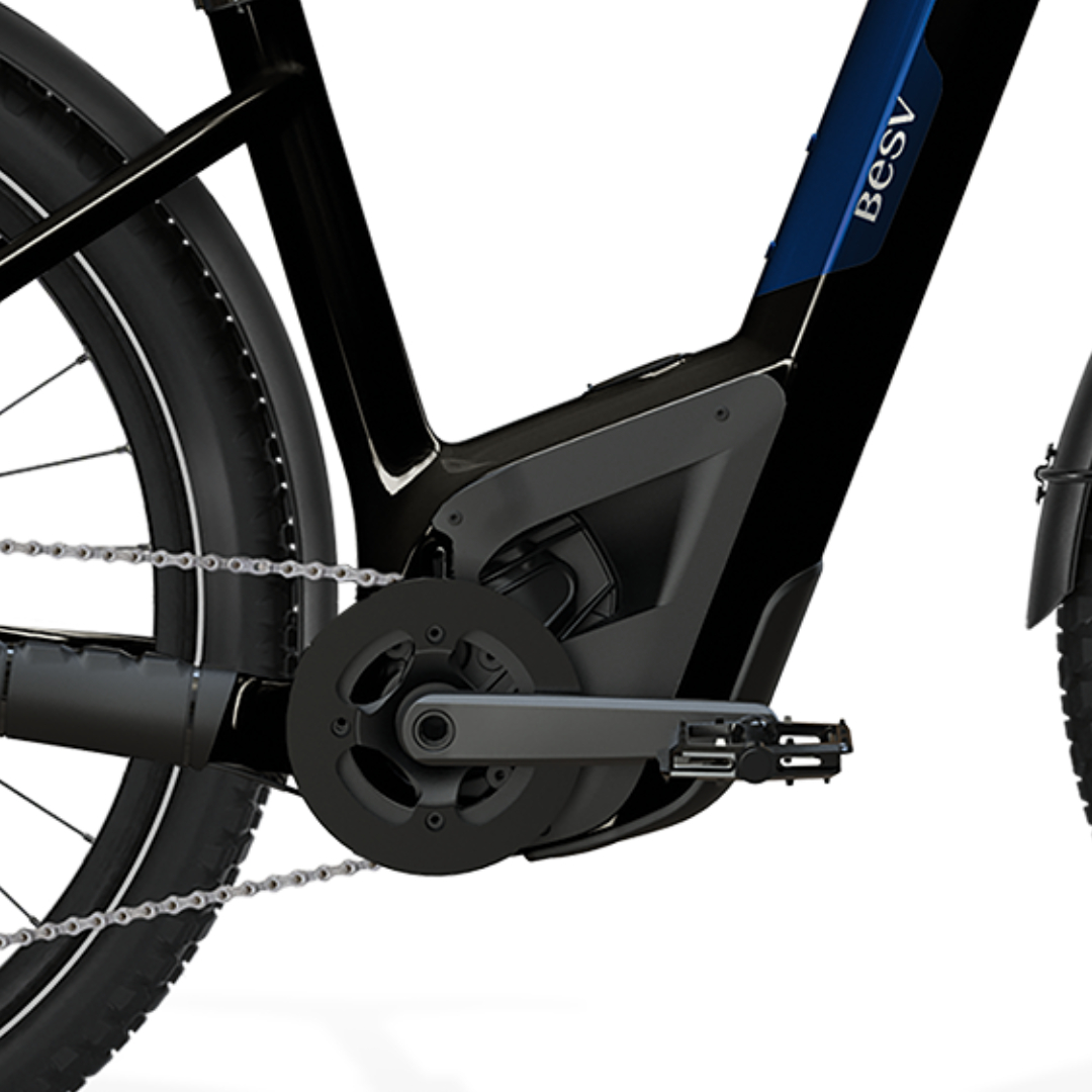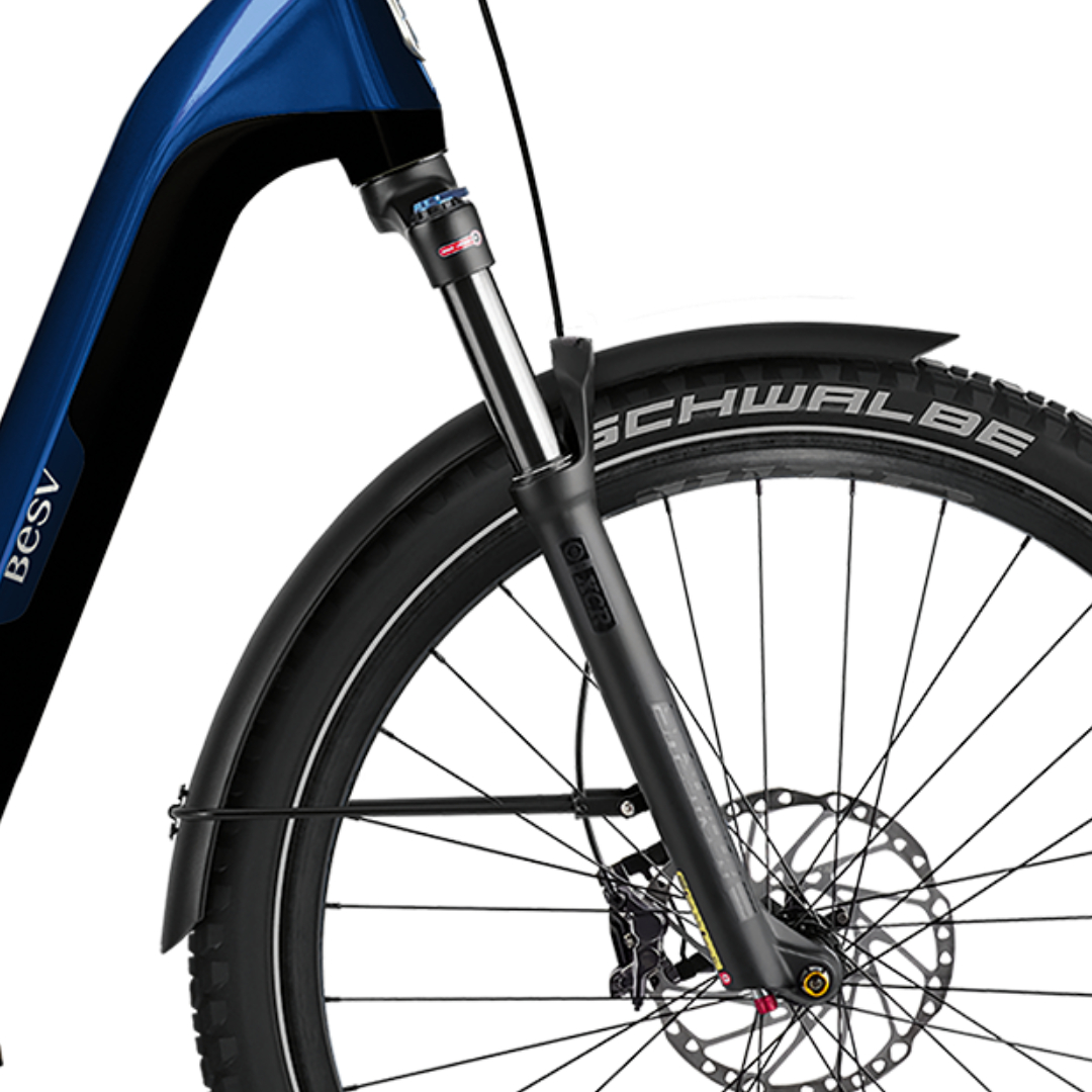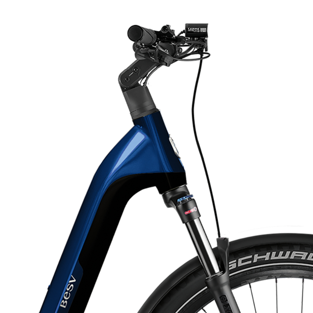 FRAMESET | FRAMEBESV TRX-B Series alloy frame, Bosch eBike system compatible COLOR(S)Deep Sapphire Blue with Night Black SIZESS (42.5cm), M (46cm), L (50cm) FORKSR Suntour XCR34, 34mm stanchions, Lockout, Air damping, 1.1/8"-1.5" tapered alloy steerer, travel: 120mm REAR CARRIERTubular aluminium carrier, with MIK HD platform and spring clamp FENDERSSKS PET fenders, aluminium hardware |