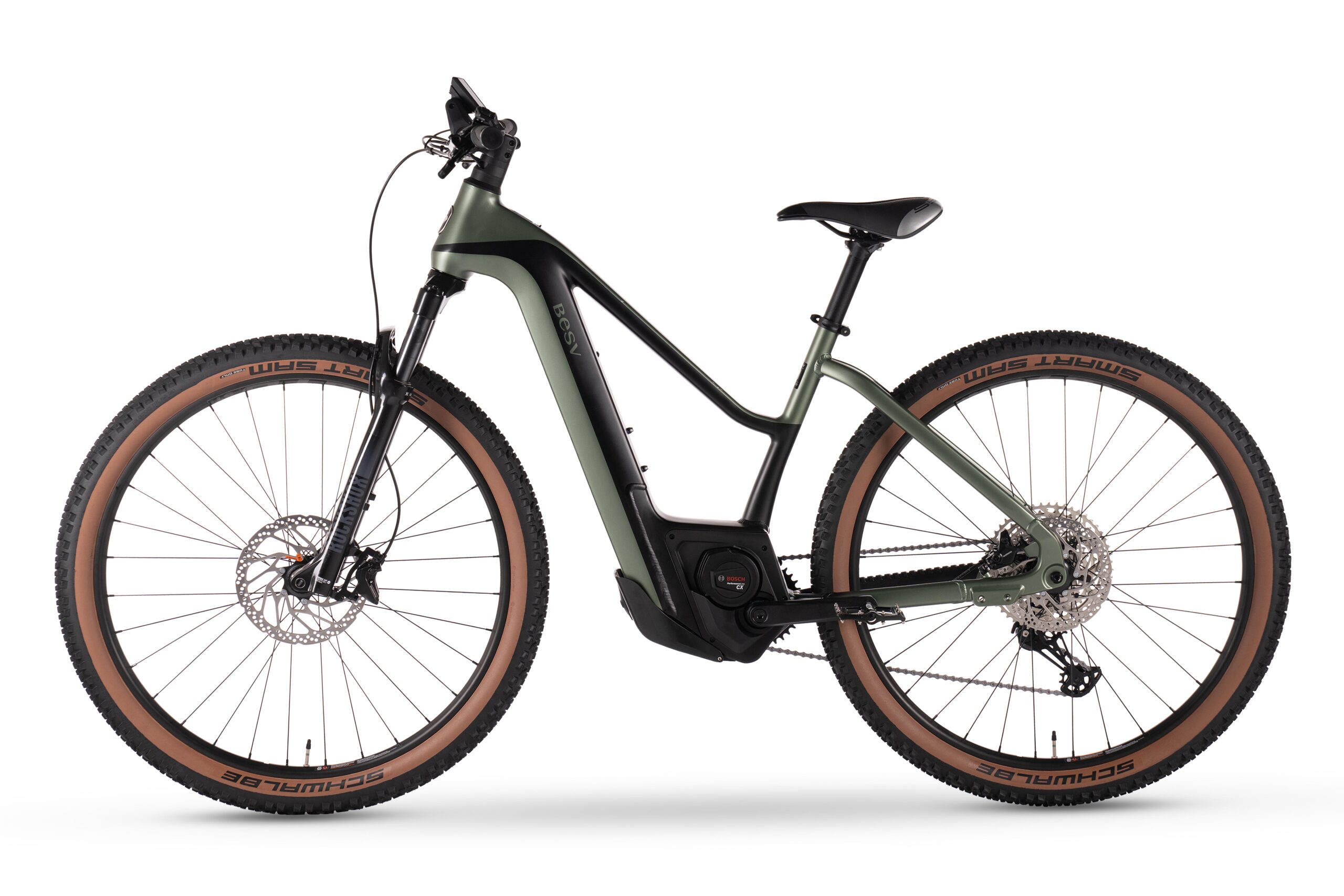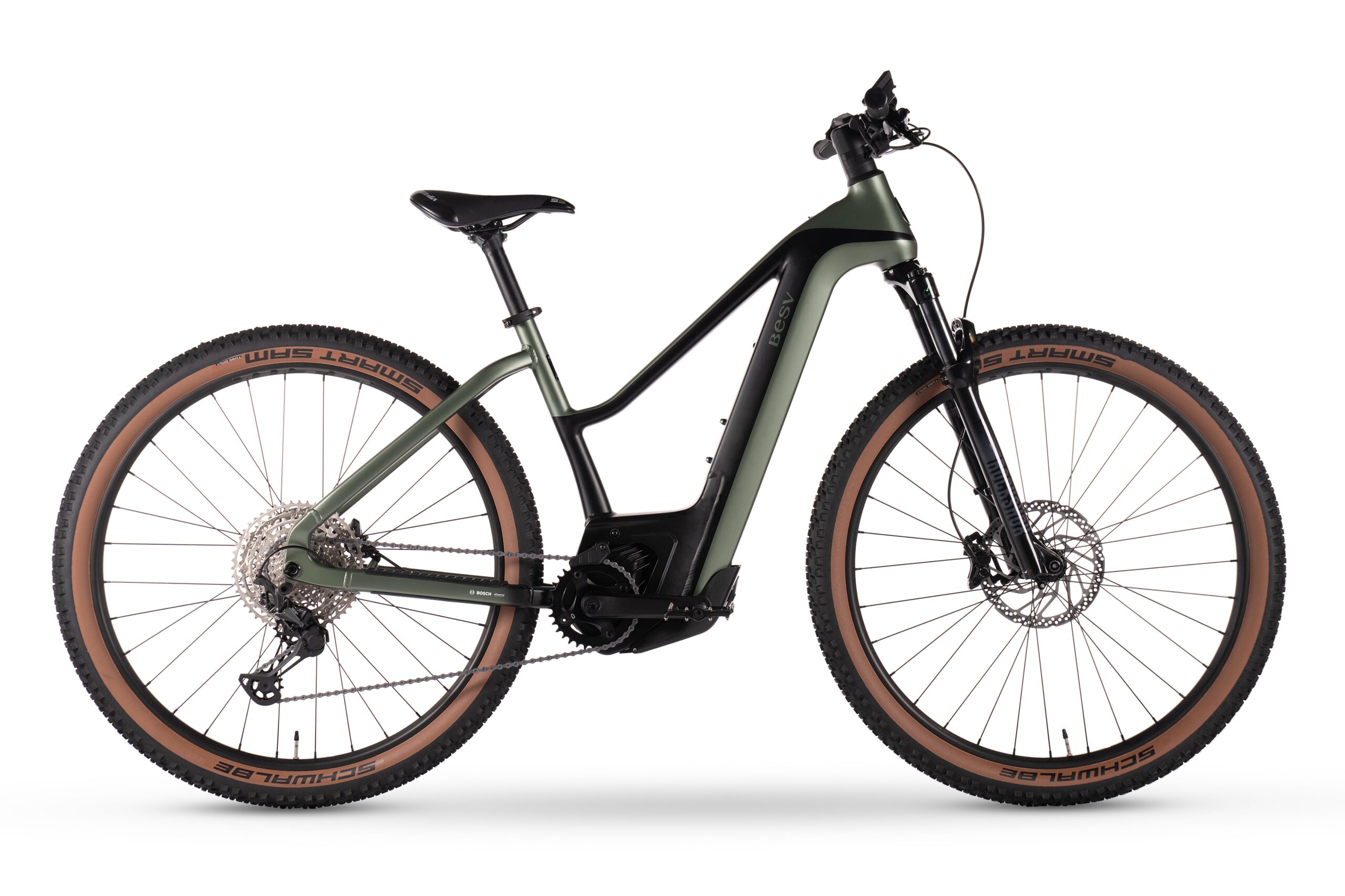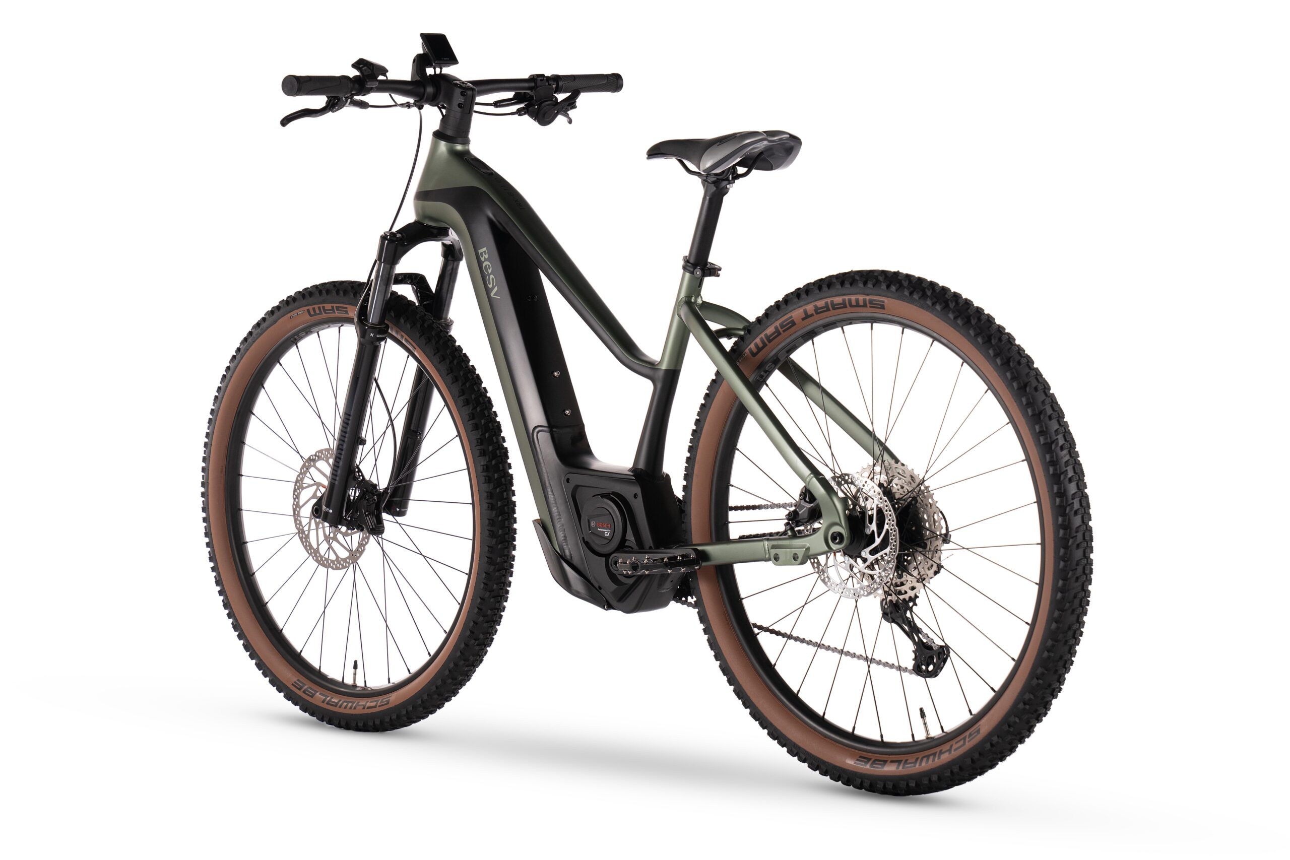 FRAMESET | FRAMEHard-tail BESV TRX-B Series smooth welded alloy frame, Bosch motor and internal battery compatible COLOR(S)Jade green with black satin SIZESS (42.5cm), M (46cm), L (49cm) FORKRock Shox Recon Silver RL, 32mm stanchions, Solo Air with Motion Control, 1 1/8"-1.5" tapered alloy steerer, travel 120mm, Maxle Stealth |