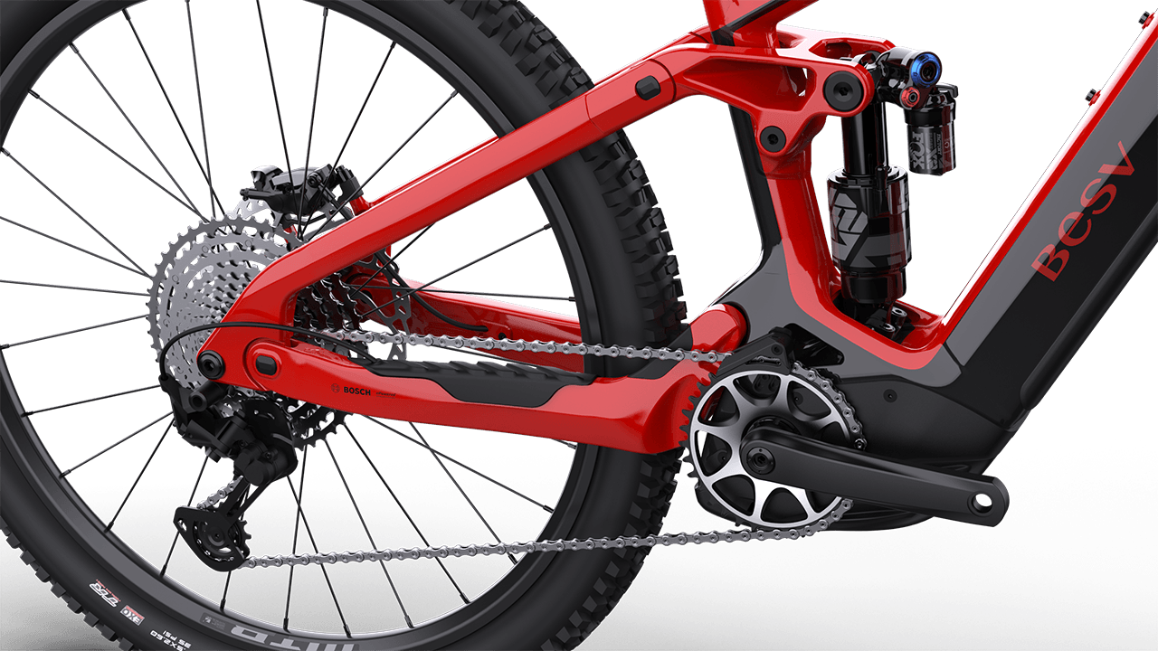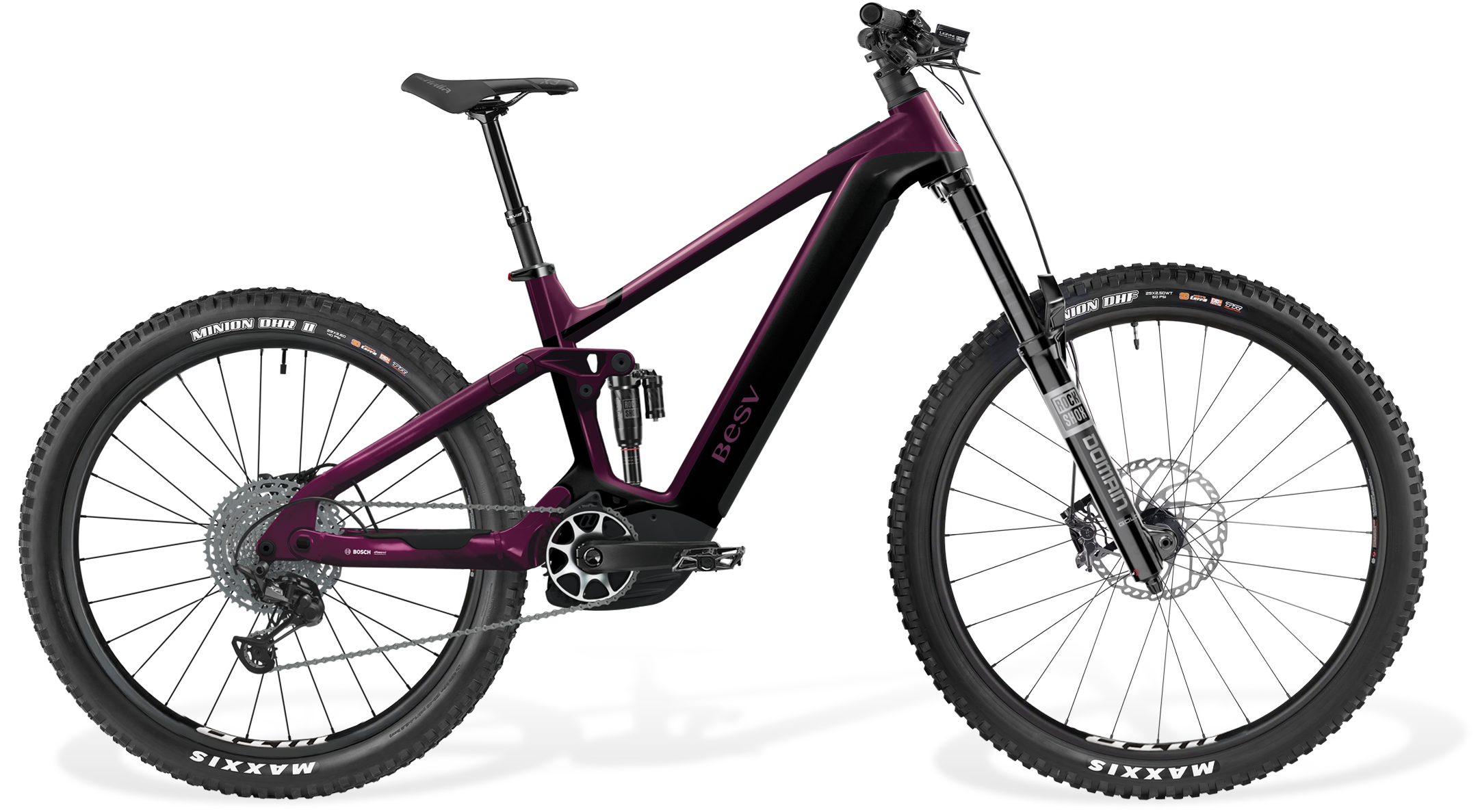 FRAMESET | FRAMEBESV TRS-B 170 Series alloy frame, smooth welded, Bosch eBike system compatible, Gen.5 motor mount COLOR(S)Dark purple with black gloss SIZESS (41.5cm), M (43cm), L (46cm) FORKRock Shox Domain Gold R, 38mm stanchions, Debon Air, 1.1/8"-1.8" tapered alloy steerer, 170mm travel, Maxle Light Rear ShockRock Shox Super Deluxe, DebonAir, 185x55, 160mm rear wheel travel |